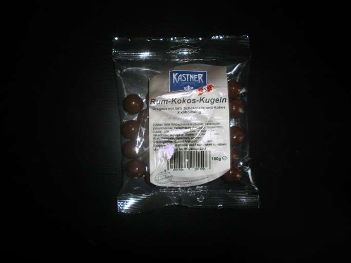 Bonbóny s alkoholickou náplní 10%, čokoládou 9%, kokos, vše obalené v mléčné čokoládě 59%.