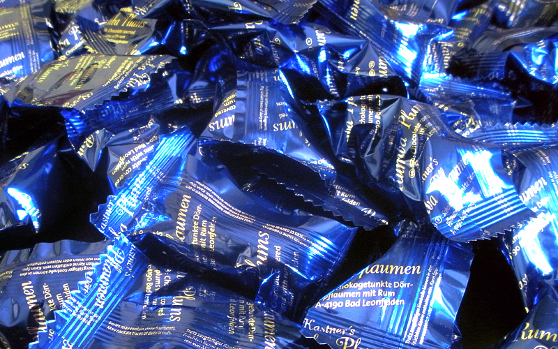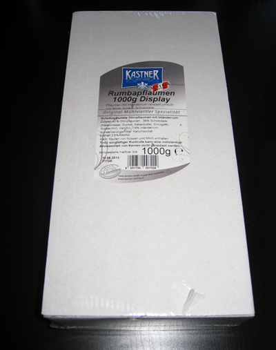 Složení: 41 % sušené švestky, 38 % čokoláda (kakaová hmota, cukr, kakaové máslo, emulgator, sojový lecithin, vanilin) 19 % rakouský rum.